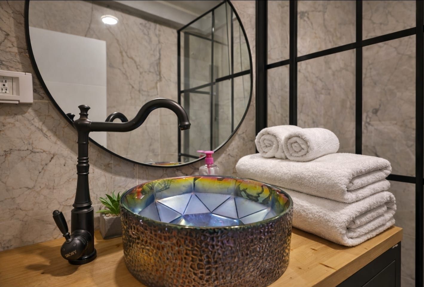 - חדר רחצה עם מגבות, שמפו ותחליבי רחצה.